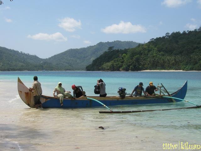 Ealah, baru aja dibilangin kalo teluk Kiluan tuh adanya di Lampung! Di sana tante dari hari Jumat Malem sampe Senen pagi. Begini kronologis perjalanannya kalo dari Jakarta, tepatnya dari Circle K Pancoran, meeting point tante bersama para dugong2 lucu yang juga ikut ke sana. Dari meeting point hari Jumat malem jam 11 tgl 7 Agustus 09, kurang lebih 2,5 jam ke Pelabuhan Merak. Ini pake Elf lho ya, kalo pake Buraq mah 5 menit juga udah nyampe. Trus dari Merak, naik kapal Feri kurang lebih 2,5 jam, sampe di pelabuhan Bakaheuni. Dari situ, 3 jam ke Bandar Lampung, masih terus lagi kira-kira 3 jam ke Teluk Kiluan. Sehingga kira-kira 6 jam dari Bakaheuni, atau 12 jam kalo dari meeting point. Tante nyampe tujuan hari Sabtu 8 Agustus 09 jam 11 siang.