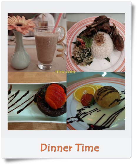 Karena pasangan traveling saya kali ini adalah neng Widya yang ogah ribet, ditambah lagi ini adala trip tidak ambisius, maka kami memutuskan untuk makan malam di Hotel saja. Harga-harganya harga standar hotel, namun untuk jusnya agak pricey, sekitar 60.000an per gelas. Ternyata hal itu dikarenakan jus yang mereka buat tidak memakai gula dan air sama sekali.