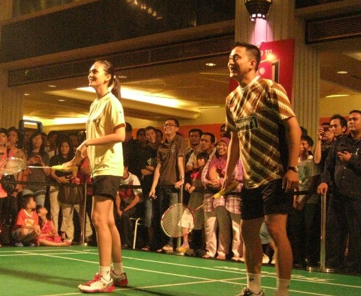 Saudara-saudara, Luna Maya datang ke lapangan itu dengan gagah berani untuk main bulu tangkis bersama para atlet dan penonton! Tidak hanya 1 pertandingan, dia memainkan 2 pertandingan! Pertandingan pertama, dengan berpasangan dengan idola saya Ricky Subagja, mereka melawan orang Jepang yang ecek2 banget mainnya. Luna juga terlihat tidak bisa main, tapi dia total. Mau mengejar bola ke sana dan ke sini, meskpiun kakinya kelihatan sedikit sakit.